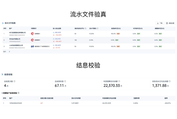 从流水文件结构、结息情况、余额陆续在性等完成多维流水验真,同时支持主体账户总况、对手方交易、异常流水等深度分析场景